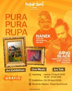 Pameran seni “Pura Pura Rupa” menghadirkan karya dua seniman, Nanek dan Bang Black, yang menampilkan eksplorasi artistik dengan karakter visual yang kuat dan reflektif. Pameran ini berlangsung pada 24-30 April 2026 di North Art Space, Pasar Seni Ancol, menghadirkan art exhibition, live music, dan art talk yang terbuka untuk publik.