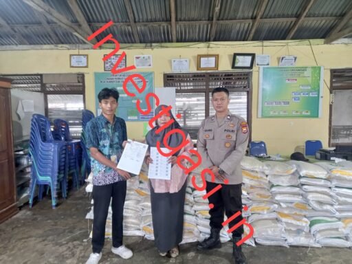 Penyaluran yang dipusatkan di balai desa itu dikawal langsung oleh perangkat desa bersama Bhabinkamtibmas. Tampak tumpukan karung beras dan perwakilan penerima memegang dokumen sebagai bukti serah terima.