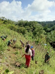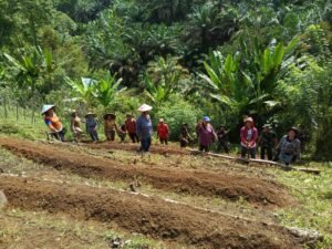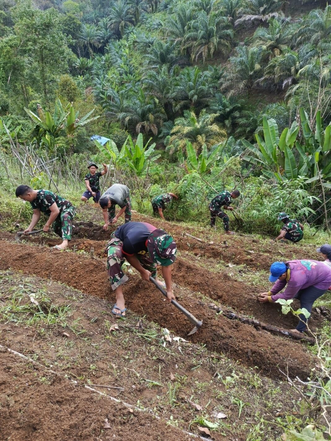 Sanggau – Di bawah terik matahari, personel Satgas TMMD Ke-128 Kodim 1204/Sanggau bersama warga tetap menunjukkan semangat kebersamaan dalam melaksanakan kegiatan penanaman cabai dan terong di lahan yang berlokasi di Dusun Onggok.